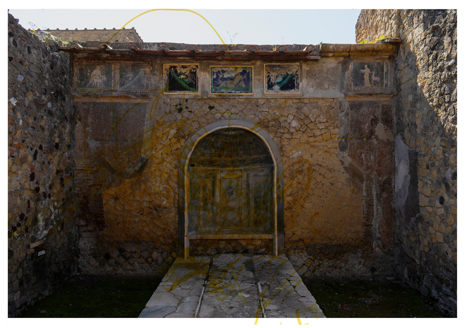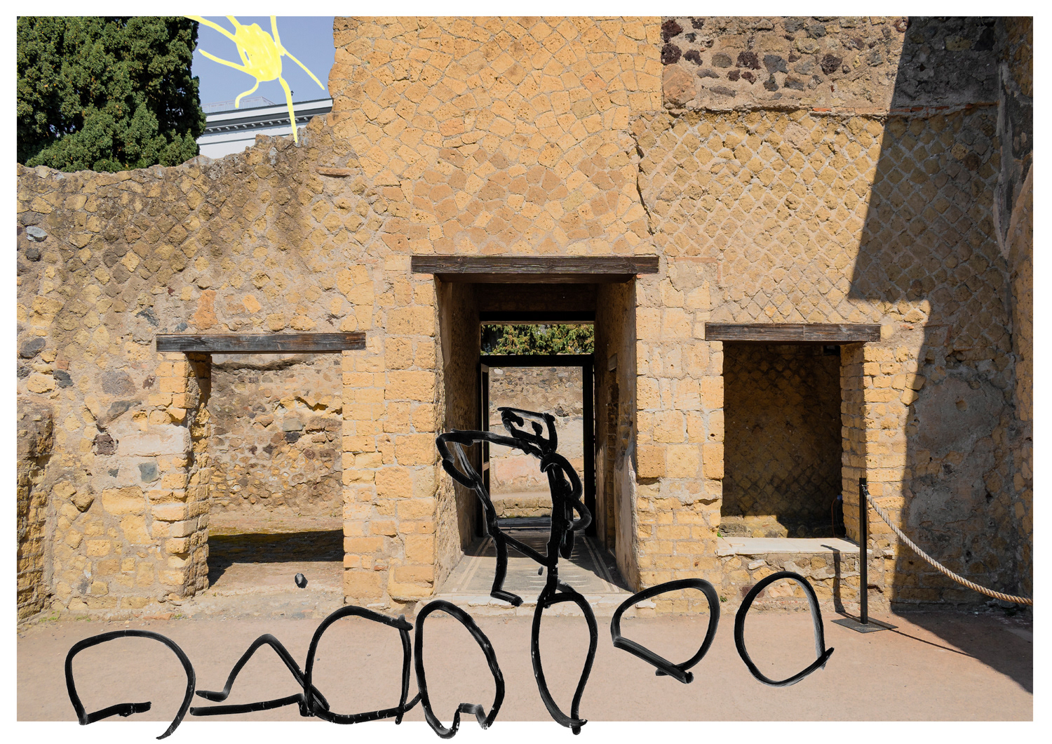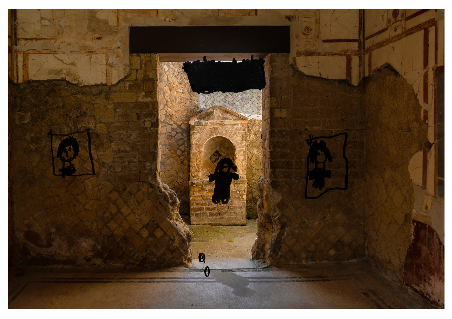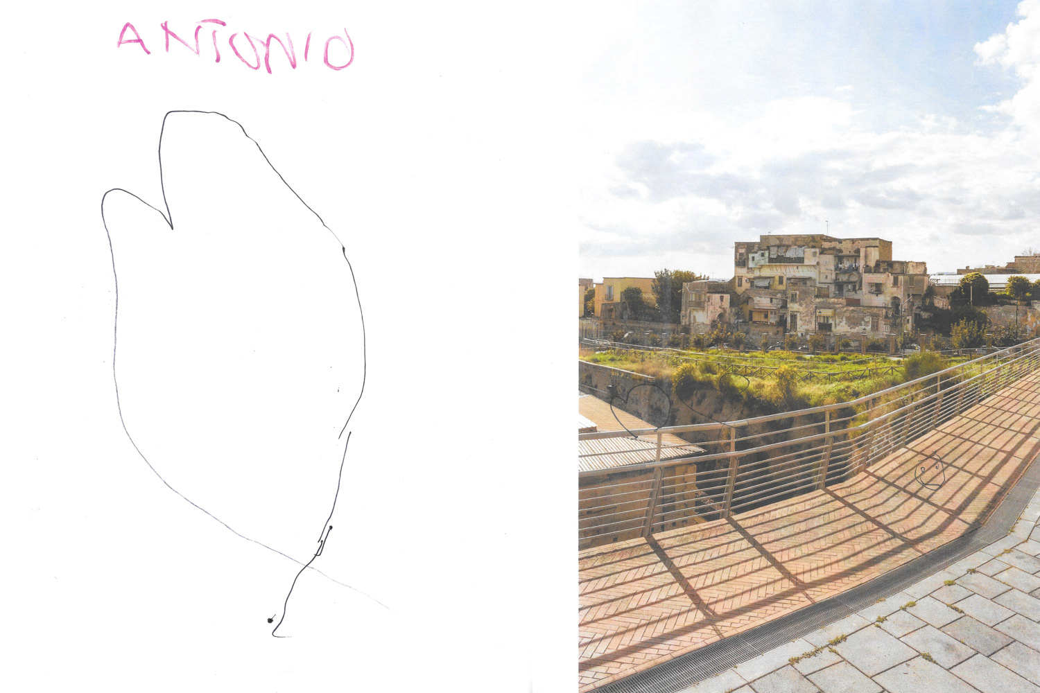 Vita negli scavi è un progetto che racconta l’immaginario delle bambine e dei bambini di Via Mare, una storica strada di Ercolano che affaccia direttamente sul Parco Archeologico omonimo. Qui, la presenza degli scavi è parte integrante della vita quotidiana: non è sono solo un sito archeologico, ma un elemento vivo del tessuto urbano e sociale. L’idea nasce dal desiderio di osservare e raccontare questo legame attraverso lo sguardo dei più piccoli, che abitano la via e vivono lo spazio pubblico con fantasia, curiosità e speranza. Le loro voci, i loro sogni e le loro visioni diventano una chiave inedita per rileggere il dialogo tra la città moderna e l’eredità del passato. Ho realizzato una serie di fotografie all’interno del Parco Archeologico di Ercolano, successivamente stampate e sovrapposte con fogli di acetato trasparente. Su questi fogli, i bambini hanno disegnato come si immaginano la vita tra gli scavi: chi sarebbero stati, cosa avrebbero fatto, come sarebbe stato abitare in quel luogo carico di storia ma anche come potrebbe essere il loro futuro lì se il Vesuvio non fosse mai eruttato. Attraverso le loro interpretazioni visive emergono non solo la fantasia e la spontaneità tipiche dell’infanzia, ma anche le aspirazioni e la voglia di futuro di chi cresce in un luogo unico, dove l’antico incontra il quotidiano.
